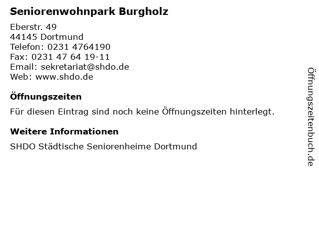 | Öffnungszeiten Seniorenwohnpark Burgholz in Dortmund anzeigen | |