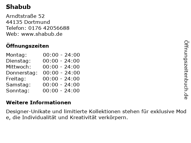 | Öffnungszeiten Shabub in Dortmund anzeigen | |