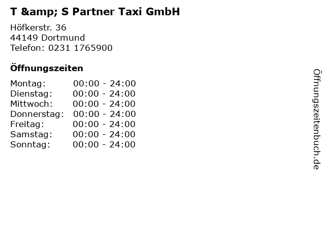 | Öffnungszeiten T & S Partner Taxi GmbH in Dortmund anzeigen | |