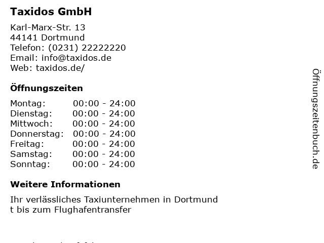| Öffnungszeiten Taxidos GmbH in Dortmund anzeigen | |
