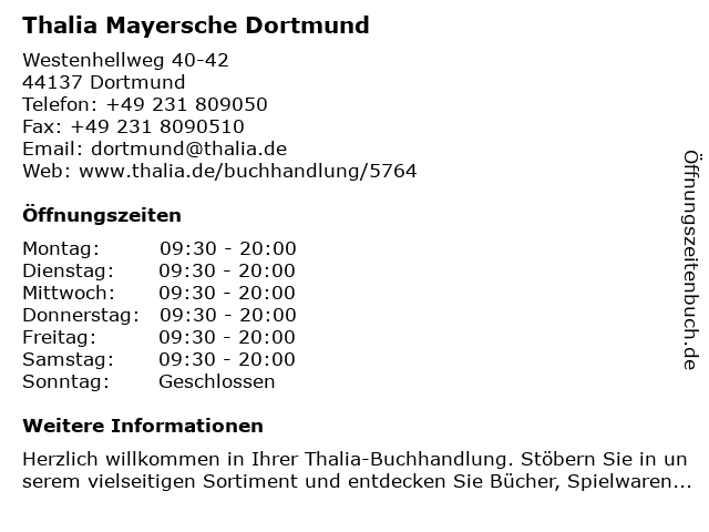 | Öffnungszeiten Thalia Mayersche Dortmund in Dortmund anzeigen | |