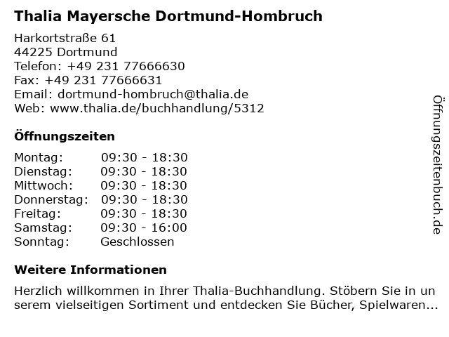 2 ROTTLER Brillen + Hörgeräte in Dortmund Hombruch (Entfernung: 0,02 km) Harkortstraße 59, 44225 Dortmund 3 Commerzbank Dortmund-Hombruch - (Geldautomat Filiale) (Entfernung: 0,02 km) Harkortstraße 63, 44225 Dortmund 5 Spezialitätenfleischerei Muntz - Wochenmarkt Hombruch (Entfernung: 0,05 km) Harkortstraße ., 44225 Dortmund 6 |
