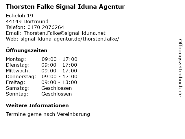 1 SIGNAL IDUNA Versicherung Thorsten Falke - Versicherungsagentur (Entfernung: 0,00 km) Echeloh 19, 44149 Dortmund 5 SIGNAL IDUNA Versicherung Detlef Roth - Versicherungsagentur (Entfernung: 4,81 km) Ostenbergstr. 15, 44225 Dortmund 6 SIGNAL IDUNA Versicherung Angelo Vieira Santos - Versicherungsagentur (Entfernung: 6,71 km) Ardeystr. 93-95, 44139 Dortmund |
