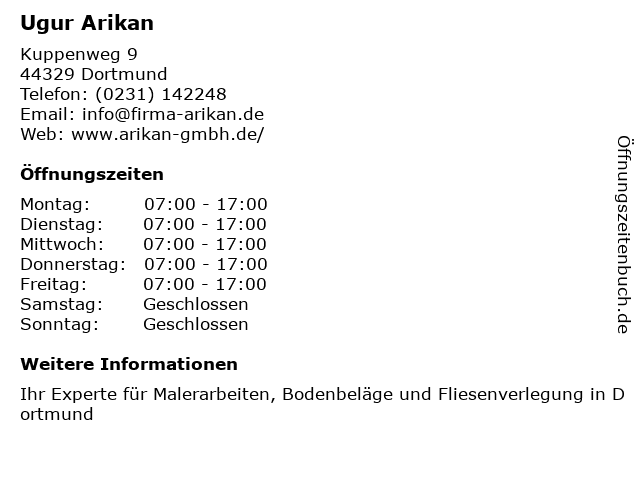 | Öffnungszeiten Ugur Arikan in Dortmund anzeigen | |