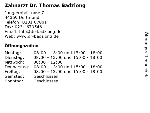 | Öffnungszeiten Zahnarzt Dr. Thomas Badziong in Dortmund anzeigen | |