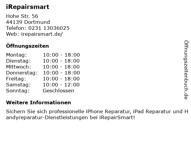 | Öffnungszeiten iRepairsmart in Dortmund anzeigen | |