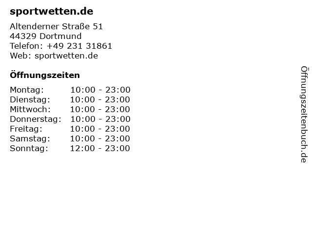 | Öffnungszeiten sportwetten.de in Dortmund anzeigen | |