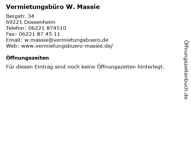 | Öffnungszeiten Vermietungsbüro W. Massie in Dossenheim anzeigen | |