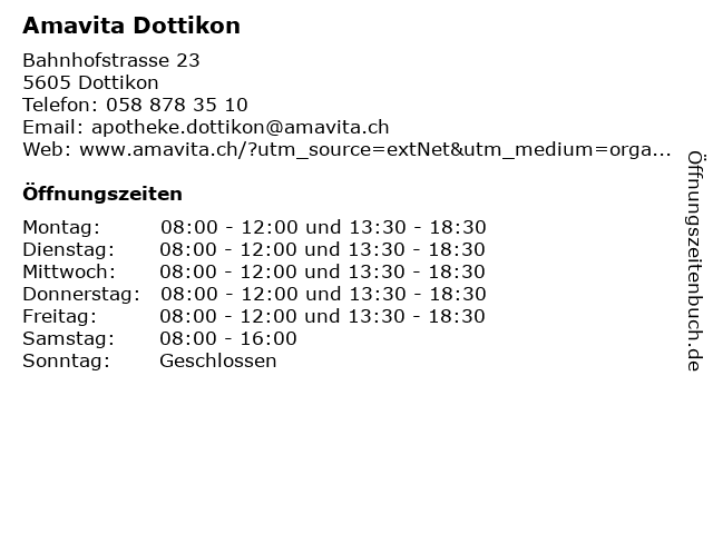 | Öffnungszeiten Amavita Dottikon in Dottikon anzeigen | |