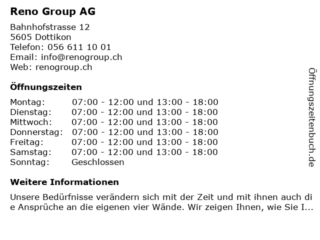 | Öffnungszeiten Reno Group AG in Dottikon anzeigen | |