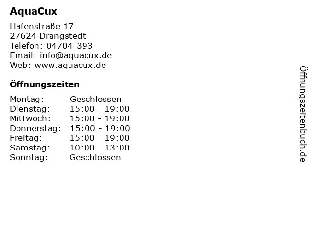 | Öffnungszeiten AquaCux in Drangstedt anzeigen | |