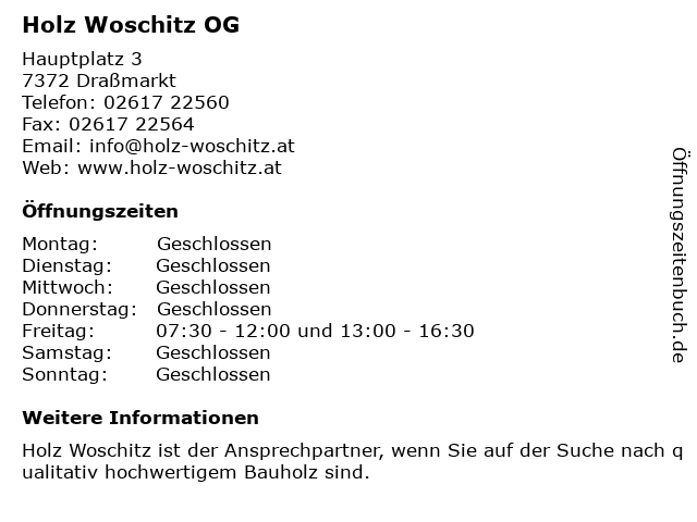 | Öffnungszeiten Holz Woschitz OG in Draßmarkt anzeigen | |