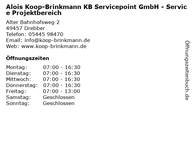 1 Alois Koop-Brinkmann KB Servicepoint GmbH - Ausstellung (Entfernung: 0,03 km) Alter Bahnhofsweg 2, 49457 Drebber 6 Öffentliche Versicherungen Oldenburg Gerhard Brinkmann (Entfernung: 13,30 km) Vogtstr. 2, 49393 Lohne |