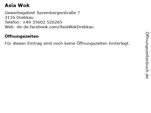| Öffnungszeiten Asia Wok in Drebkau anzeigen | |