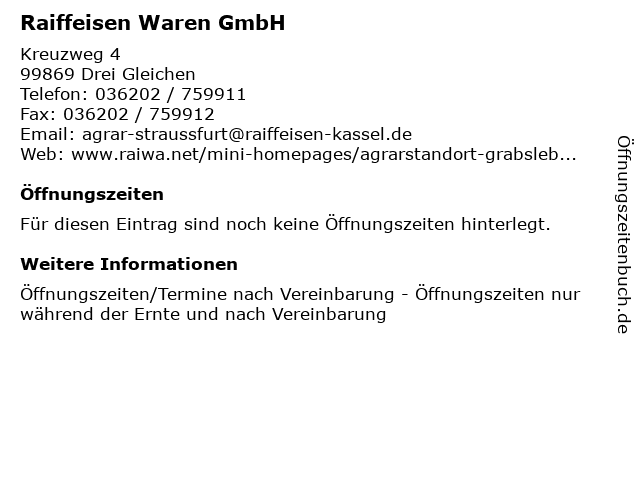 | Öffnungszeiten Raiffeisen Waren GmbH in Drei Gleichen anzeigen | |