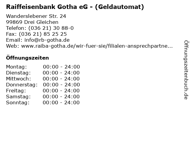 1 Raiffeisenbank Gotha eG - (Mobile Geschäftsstelle, Bankbus) (Entfernung: 3,36 km) Hauptstr. -, 99869 Drei Gleichen - Wandersleben 3 Raiffeisenbank Gotha eG - (Mobile Geschäftsstelle, Bankbus) (Entfernung: 6,44 km) Großrettbach -, 99869 Drei Gleichen - 4 Raiffeisenbank Gotha eG - (Mobile Geschäftsstelle, Bankbus) (Entfernung: 7,24 km) Grabsleben -, 99869 Drei Gleichen 5 Raiffeisenbank Gotha eG (Geldautomat Einkaufszentrum Ohrdruf) (Entfernung: 8,52 km) Bahnhofstraße -, 99885 Ohrdruf 6 Raiffeisenbank Gotha eG - (Mobile Geschäftsstelle, Bankbus) (Entfernung: 8,73 km) Hauptstr. -, 99869 Tüttleben |