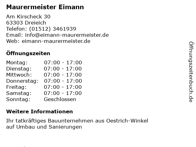 | Öffnungszeiten Maurermeister Eimann in Dreieich anzeigen | |