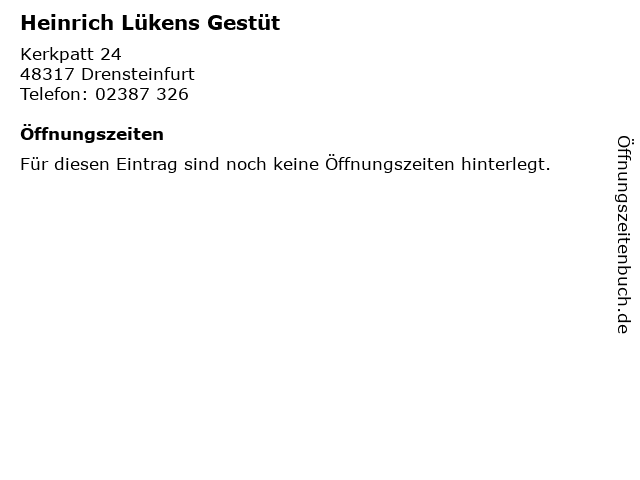 | Öffnungszeiten Heinrich Lükens Gestüt in Drensteinfurt anzeigen | |