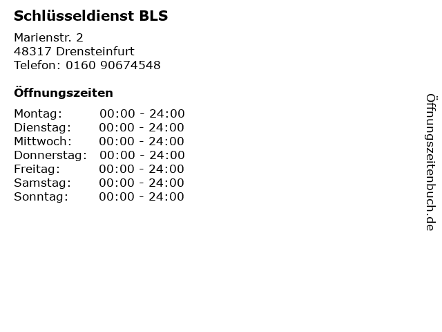 | Öffnungszeiten Schlüsseldienst BLS in Drensteinfurt anzeigen | |