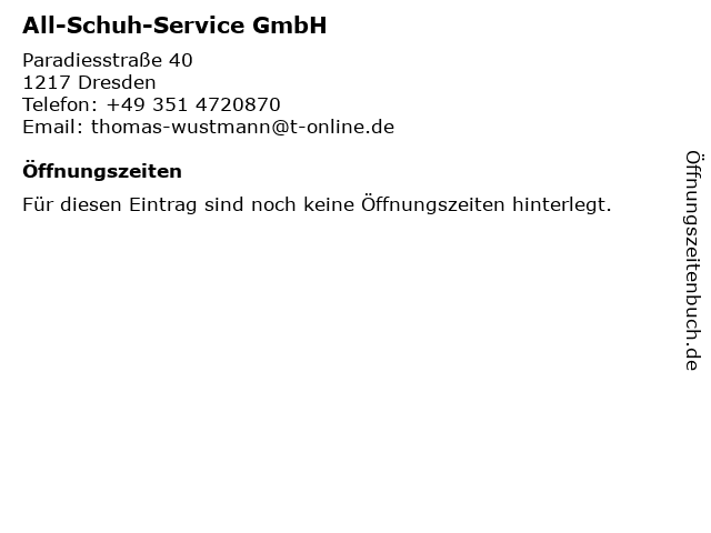 Öffnungszeiten All-Schuh-Service GmbH in Dresden anzeigen | |