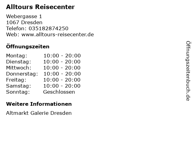 | Öffnungszeiten Alltours Reisecenter in Dresden anzeigen | |