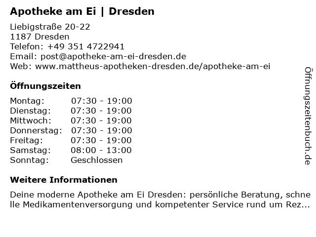 | Öffnungszeiten Apotheke am Ei | Dresden in Dresden anzeigen | |