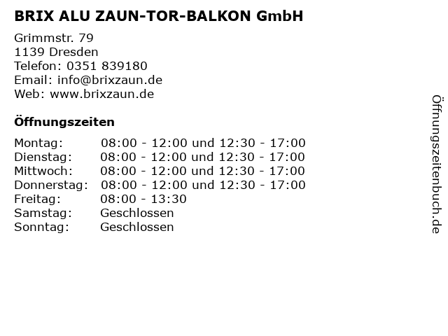 | Öffnungszeiten BRIX ALU ZAUN-TOR-BALKON GmbH in Dresden anzeigen | |