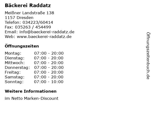 | Öffnungszeiten Bäckerei Raddatz in Dresden anzeigen | |