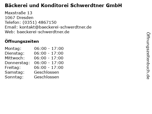 5 Bäckerei und Konditorei Schwerdtner GmbH (Entfernung: 3,32 km) Chemnitzer Straße 119-121, 01187 Dresden 6 |