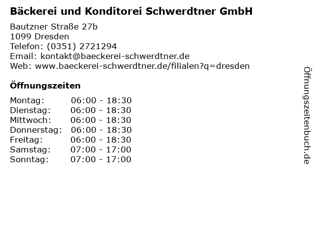 6 Bäckerei und Konditorei Schwerdtner GmbH (Entfernung: 4,87 km) Chemnitzer Straße 119-121, 01187 Dresden |