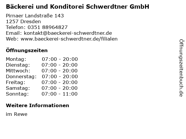 5 Bäckerei und Konditorei Schwerdtner GmbH (Entfernung: 8,72 km) Chemnitzer Straße 119-121, 01187 Dresden 6 |