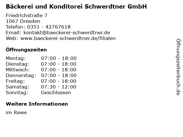 5 Bäckerei und Konditorei Schwerdtner GmbH (Entfernung: 3,34 km) Chemnitzer Straße 119-121, 01187 Dresden 6 |