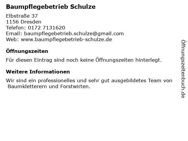 | Öffnungszeiten Baumpflegebetrieb Schulze in Dresden anzeigen | |