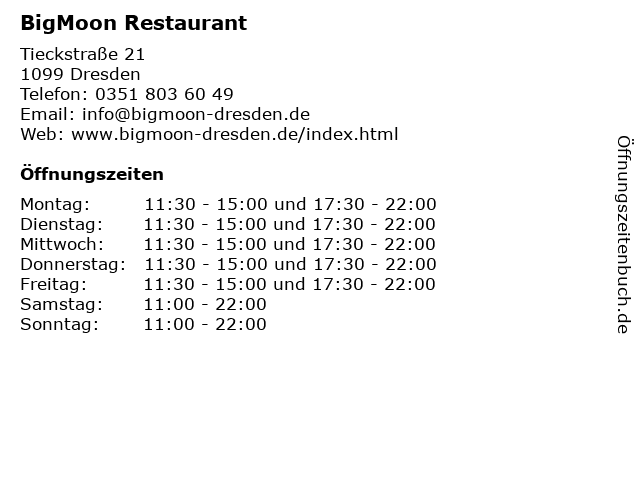 | Öffnungszeiten BigMoon Restaurant in Dresden anzeigen | |