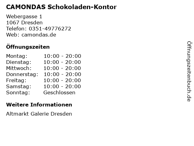| Öffnungszeiten CAMONDAS Schokoladen-Kontor in Dresden anzeigen | |