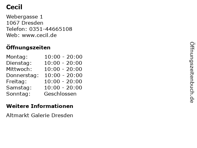 | Öffnungszeiten Cecil in Dresden anzeigen | |