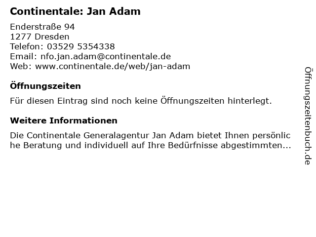 | Öffnungszeiten Continentale: Jan Adam in Dresden anzeigen | |