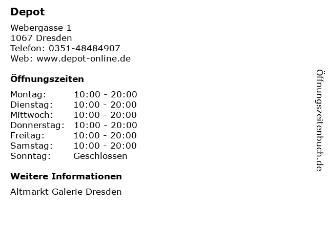 | Öffnungszeiten Depot in Dresden anzeigen | |