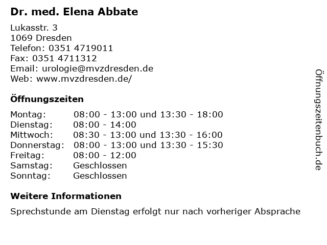 | Öffnungszeiten Dr. med. Elena Abbate in Dresden anzeigen | |