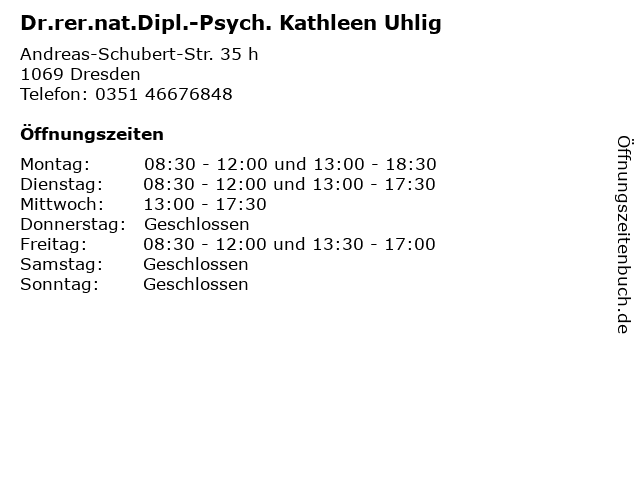 Branchen & Suchbegriffe zu Dr.rer.nat.Dipl.-Psych. Kathleen Uhlig:arzt, doktor, dr.rer.nat.dipl., kathleen, kinder, mediziner, psych., psychologische psychotherapeutin, sprechzeiten, uhlig |