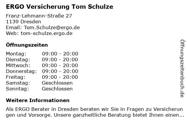 | Öffnungszeiten ERGO Versicherung Tom Schulze in Dresden anzeigen | |