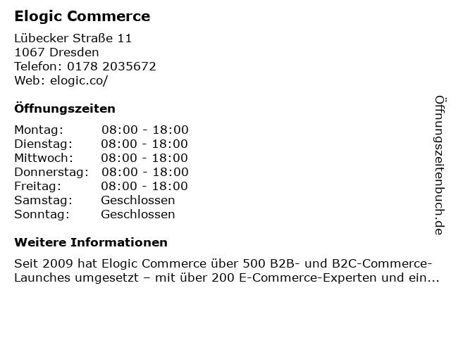 | Öffnungszeiten Elogic Commerce in Dresden anzeigen | |