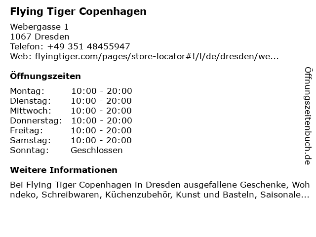 | Öffnungszeiten Flying Tiger Copenhagen in Dresden anzeigen | |
