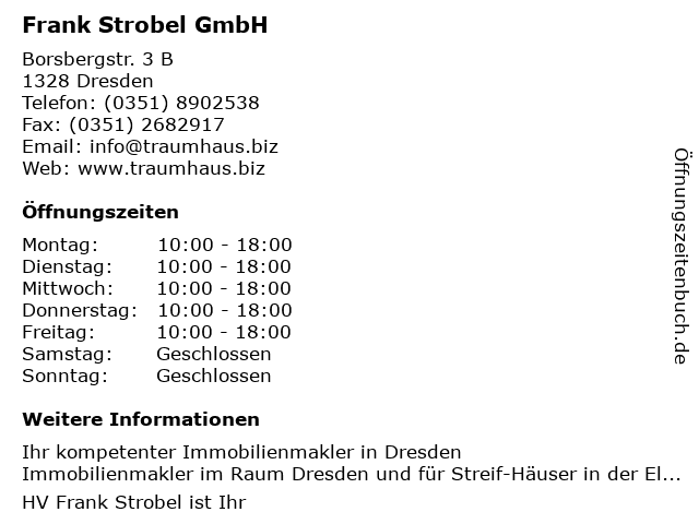 | Öffnungszeiten Frank Strobel GmbH in Dresden anzeigen | |