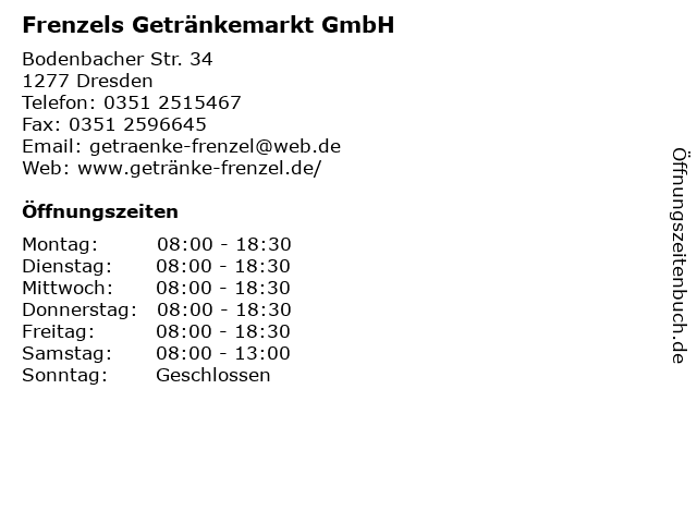 | Öffnungszeiten Frenzels Getränkemarkt GmbH in Dresden anzeigen | |