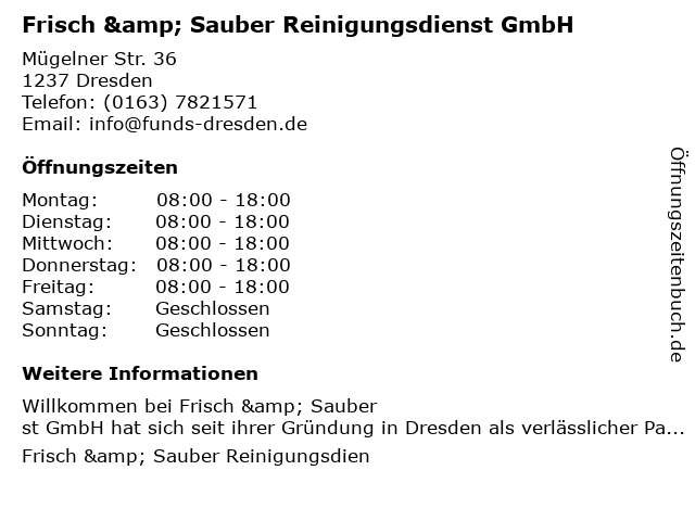 Branchen & Suchbegriffe zu Frisch & Sauber Reinigungsdienst GmbH:büroraumreinigung, endreinigung, fensterreinigungen, frisch, reinigungsdienst, sauber |