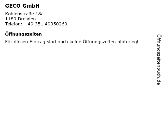 | Öffnungszeiten GECO GmbH in Dresden anzeigen | |