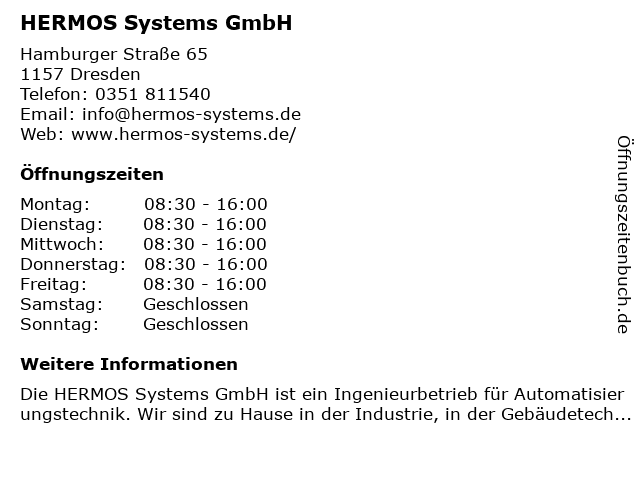 | Öffnungszeiten HERMOS Systems GmbH in Dresden anzeigen | |
