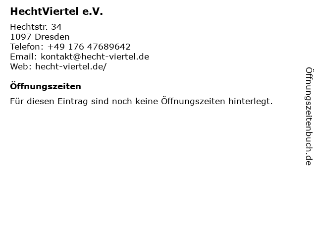 | Öffnungszeiten HechtViertel e.V. in Dresden anzeigen | |