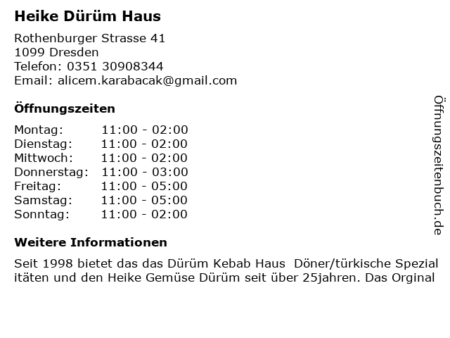 | Öffnungszeiten Heike Dürüm Haus in Dresden anzeigen | |